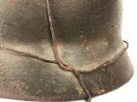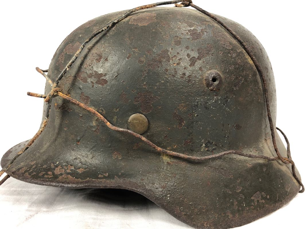 Elmo mod.35 nato biscudo, riutilizzato poi con vernice antiriflesso e fil di ferro per inserire foglie e rami a scopo mimetico.